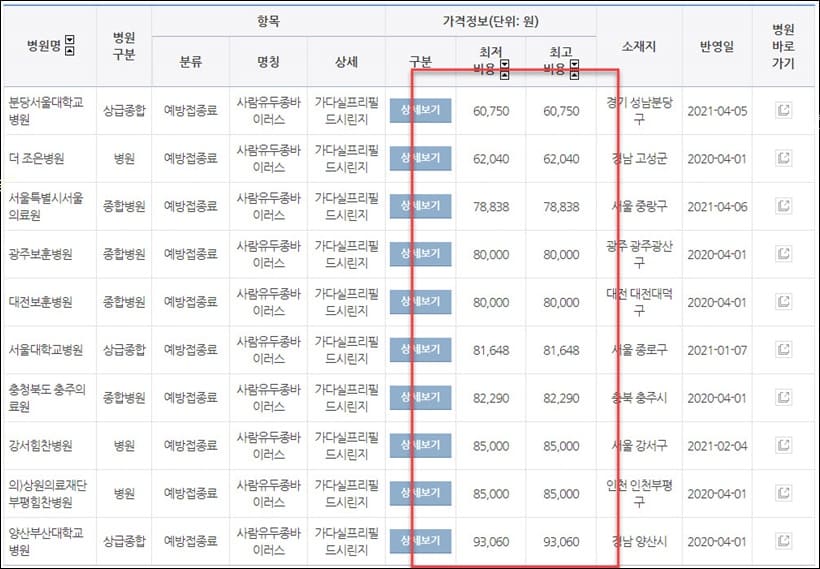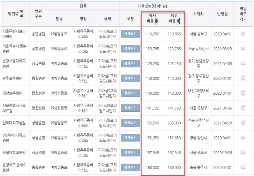 2021년 현재 기준으로는 분당서울대학교 병원에서 가장 저렴하게 예방접종을 할 수 있습니다.