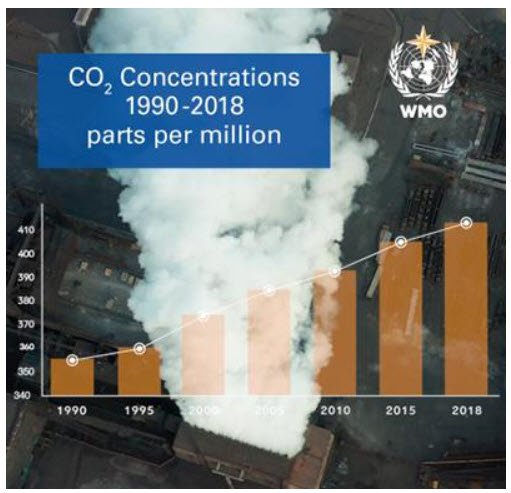 2018년 대표적인 온실 가스인 CO2의 세계 평균 농도는 407.8ppm (1ppm은 100만 분의 1)로 전년에 이어 관측 사상 최고치를 경신하고 있다.