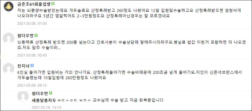 또한 치료 과정에서 비급여 항목이 많을 경우 수술 비용이 상승하게 되는데, 뇌동맥류 개두술의 경우 산정특례를 적용해도 비급여 치료가 많으면 400~500만원 정도의 치료비가 발생하기도 합니다.