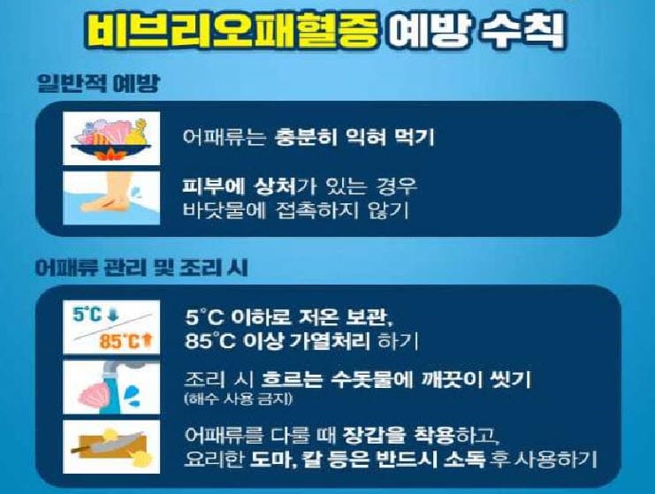 따라서 바닷물을 마시는 것은 금물이며 어패류는 익혀먹어야 합니다. 만약 피부에 상처가 났다면 흐르는 수돗물에 깨끗이 씻고 바닷물에 접촉하지 않아야 합니다.