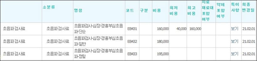 비급여에 해당될 경우 본인 부담금이 100%로 적용되기 때문에 검사비가 발생하게 됩니다. 초음파 검사 종류와 더불어 병원 종류 및 형태에 따라 검사 비용에 차이가 있습니다.
