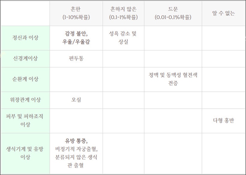 그 외 드물게 성욕 감퇴, 혈전색전증, 다형 홍반 등의 부작용이 발생할 수 있으나 희박한 확률입니다.