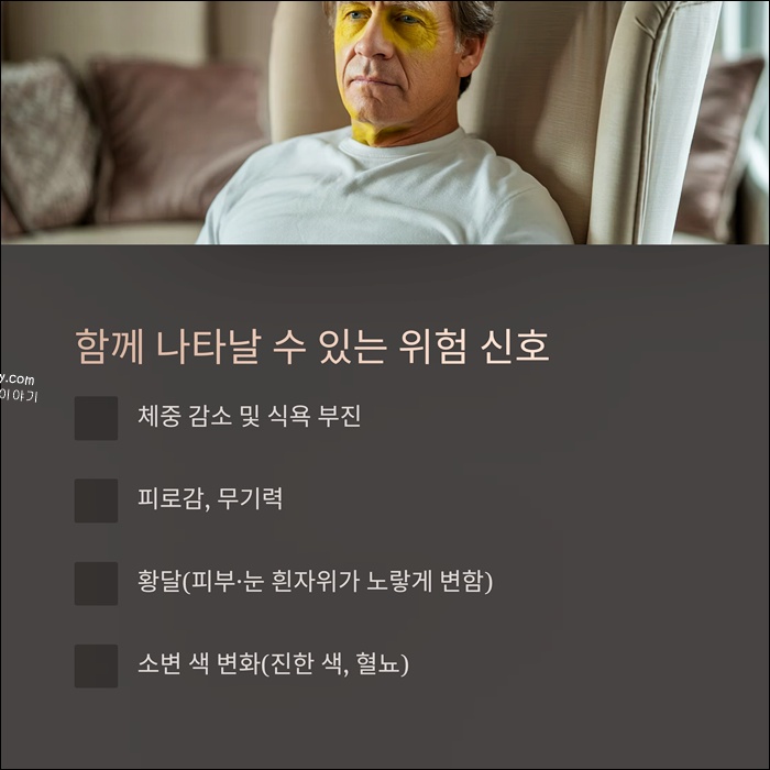 - 황달(피부·눈 흰자위가 노랗게 변함)