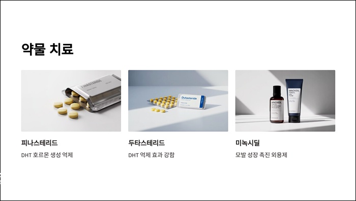 | 치료법 | 약물치료(피나스테리드, 미녹시딜), 두피 관리, 영양 섭취, 스트레스 관리, 조기 상담 |
