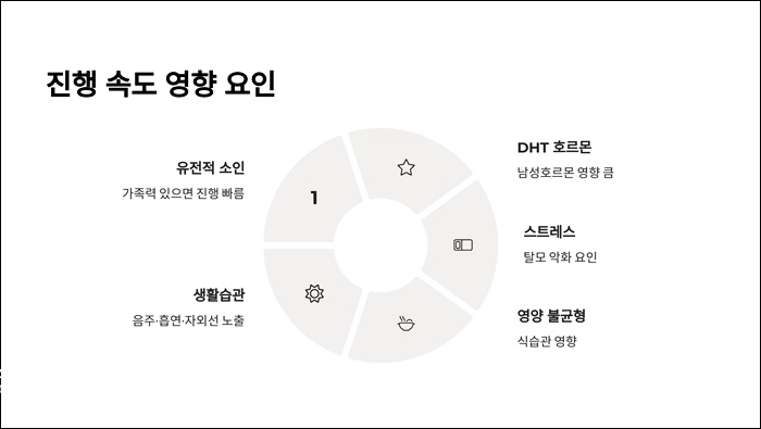 | 진행 속도 | 20~40대 남성에서 빠르게 진행, 가족력·호르몬 영향 큼. 조기 관리 시 늦출 수 있음. |