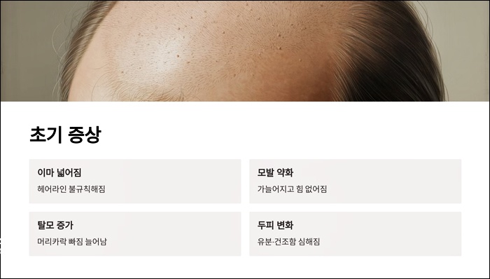 | 초기 변화 | 이마 양쪽 헤어라인 후퇴, 모발 가늘어짐, 머리 빠짐 증가, 두피 노출 시작 |