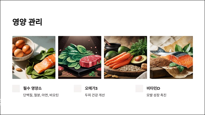 모발 건강에 중요한 단백질, 철분, 아연, 비오틴, 오메가3, 비타민D 등을 충분히 섭취하세요. 편식이나 다이어트, 불규칙한 식사는 탈모 진행을 촉진할 수 있습니다. 필요시 영양제 복용도 고려할 수 있지만, 전문가 상담 후 선택하는 것이 안전합니다.